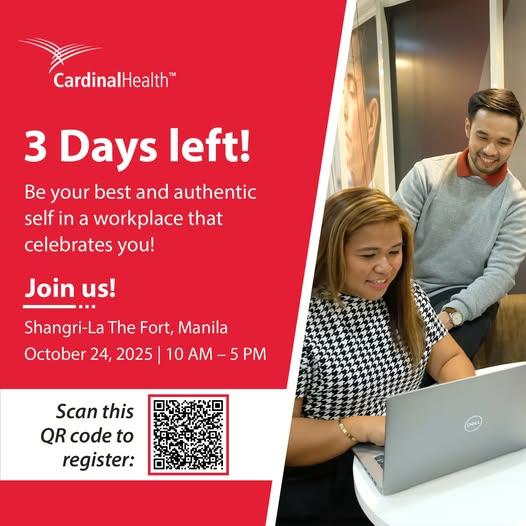 #CommittedToYourJourney #CardinalHealthOnly a Few Days Left Grow your career at Cardinal Health — where you can nurture your skills, stay true to who you are and thrive in a multicultural, collaborative environment. Don’t miss this chance to discover a workplace that celebrates you. Scan the QR code to pre-register today. https://bit.ly/48Tpvgw #CommittedToYourJourney #CardinalHealth0 التعليقات 0 المشاركات 5 مشاهدة 0 معاينةالرجاء تسجيل الدخول , للأعجاب والمشاركة والتعليق على هذا! -