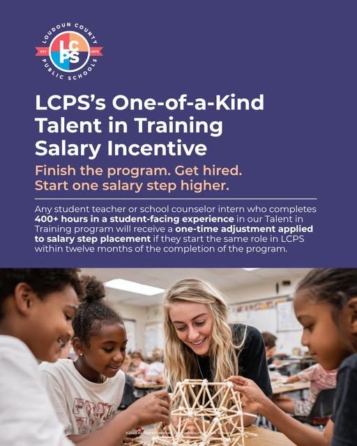 You won’t find this benefit in neighboring school divisions. Get your training hours right here with LCPS’s Talent in Training program and experience the real advantages! For more info: https://lcps.pub/48HRjnWEarn more from day one. Finish the LCPS Talent in Training program and start your teaching career one step ahead – literally. Student teachers or school counselor interns who complete 400+ hours of student-facing experience with LCPS are qualified to receive a one-time adjustment applied to salary step placement. You won’t find this benefit in neighboring school divisions. Get your training hours right here with LCPS’s Talent in Training program and experience the real advantages! For more info: https://lcps.pub/48HRjnW0 Comments 0 Shares 86 Views 0 Reviews -
