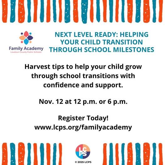 Free for all LCPS families with students in grades K-12.Next Level Ready: Helping Your Child Transition Through School Milestones The session focuses on key school transitions, including starting kindergarten, moving from fifth grade to middle school, and advancing from eighth grade to high school. Whether families are preparing for the first day or the next big step, this Family Academy session helps them know what to expect and how to support their child along the way. Join us Nov. 12 at 12 or 6 p.m. To learn more or register: lcps.org/familyacademy Free for all LCPS families with students in grades K-12.0 Comments 0 Shares 82 Views 0 Reviews -