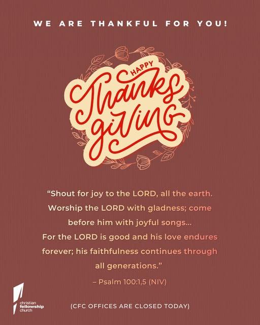#cfcwiredHappy Thanksgiving! We are thankful for you and wish a wonderful day to you and your loved ones. Let us be thankful to our faithful, good, and loving God. 1 Shout for joy to the Lord, all the earth. 2 Worship the Lord with gladness; come before him with joyful songs. 3 Know that the Lord is God. It is he who made us, and we are his; we are his people, the sheep of his pasture. 4 Enter his gates with thanksgiving and his courts with praise; give thanks to him and praise his name. 5 For the Lord is good and his love endures forever; his faithfulness continues through all generations. (CFC offices are closed for the day.) #cfcwired0 Comments 0 Shares 213 Views 0 Reviews -
