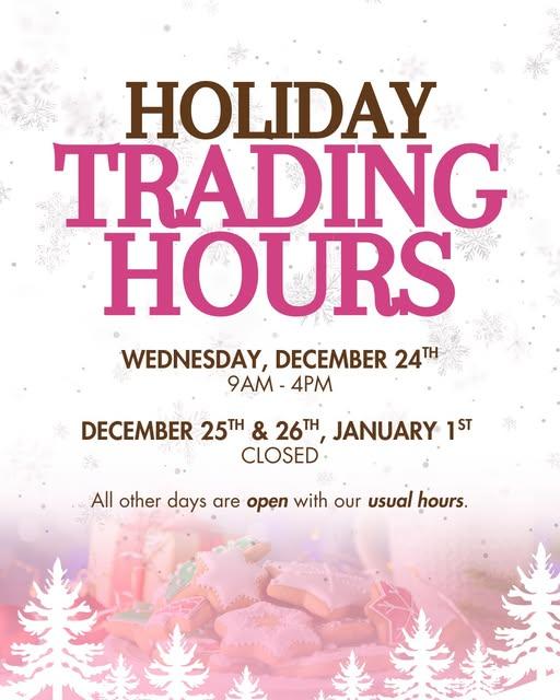 Check out our holiday trading hours so you don't miss out ❤️Planning your festive treats? 🎁 Check out our holiday trading hours so you don't miss out ❤️0 التعليقات 0 المشاركات 9 مشاهدة 0 معاينة1